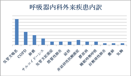 当院呼吸器内科は、感染症、腫瘍、アレルギ-性疾患など呼吸器疾患全般を対象に外来通院および入院加療を行っています。外来は、週2回(火、水)の午前診、午後診、夜診の3パタ-ンの時間帯をそれぞれ自分の生活に合わせて選択できます。中でも水曜午後は予約制の診療を行っており特にCOPD(慢性閉塞性肺疾患)等で在宅酸素療法を行っている場合酸素ボンベの許容量もあり待ち時間が心配になりますが、予約により待ち時間が短縮できるので安心して通院することができます。